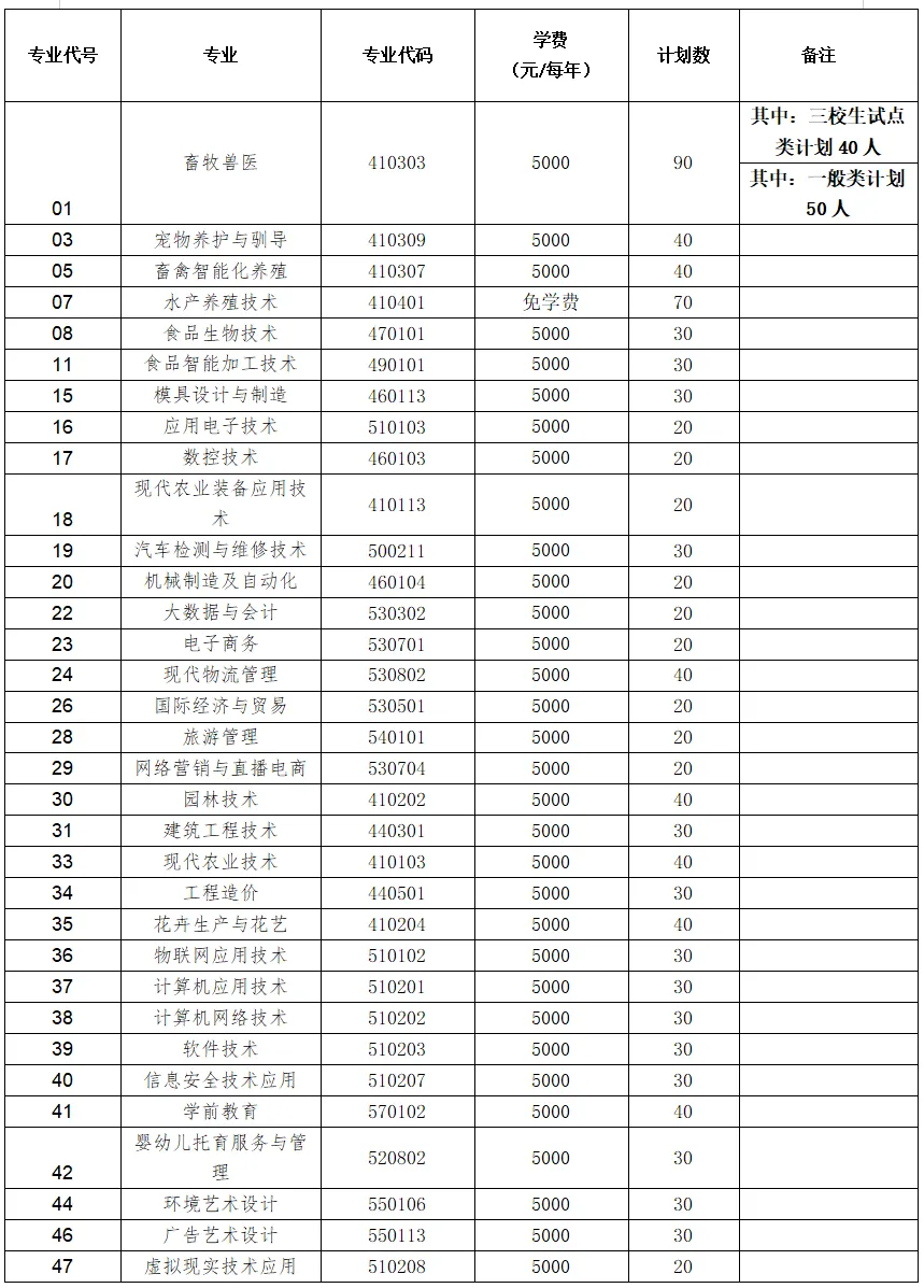 (一)专业组:001 (含专业33个,共招生1060人)其他一般类专业计划1020人(含畜牧兽医50人计划);其中:一般类专业计划为1020人(含畜牧兽医50人计划),三校生试点类计划为40人(畜牧兽医)。